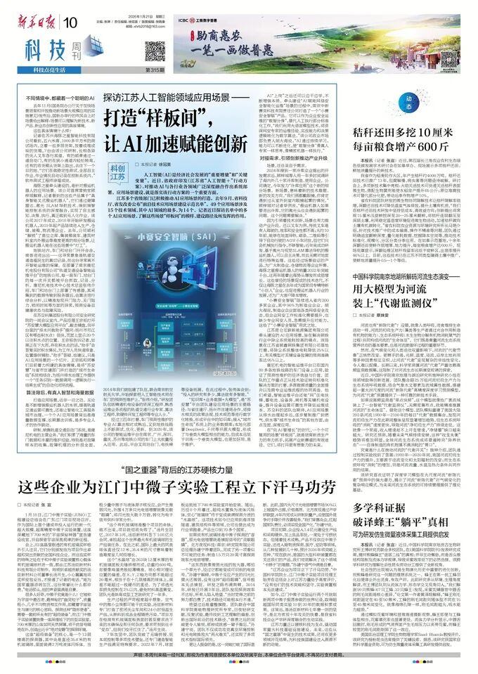 2026年1月21日,《新华日报》以《探访江苏人工智能领域应用场景——打造“样板间”, 让AI加速赋能创新》为题,报道了333体育等入选江苏省“前沿技术应用场景建设示范名单”企业,在应用场景建设方面的实践与成效。
