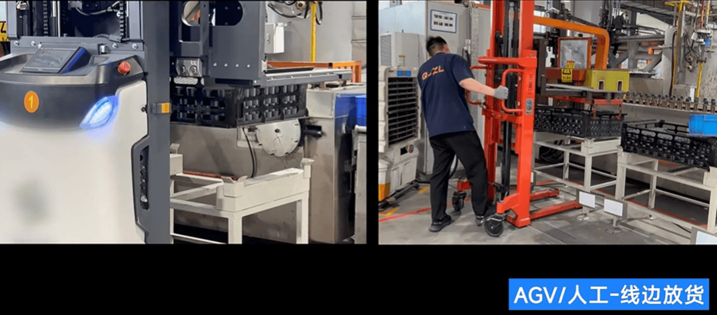 ①生产车间线边仓:AGV与滚筒输送线对接,实时抓取生产线完工的变速箱总成,直接转运至装配线,减少人工转运造成的15%效率损耗。